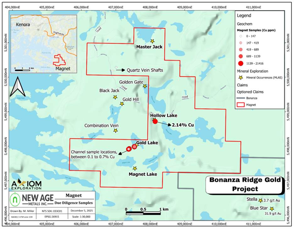 With this acquisition, the Magnet Lake Property will be incorporated into the Company’s rapidly expanding Bonanza Ridge Gold and Critical Metals Project (see news release dated October 27, 2025: New Age Metals Receives Exchange Approval for Bonanza Gold Project, Kenora Gold District, Ontario). This addition reinforces New Age Metals’ commitment to building one of the largest claim holdings in the Kenora Mining District — an emerging critical- and precious-metals region.