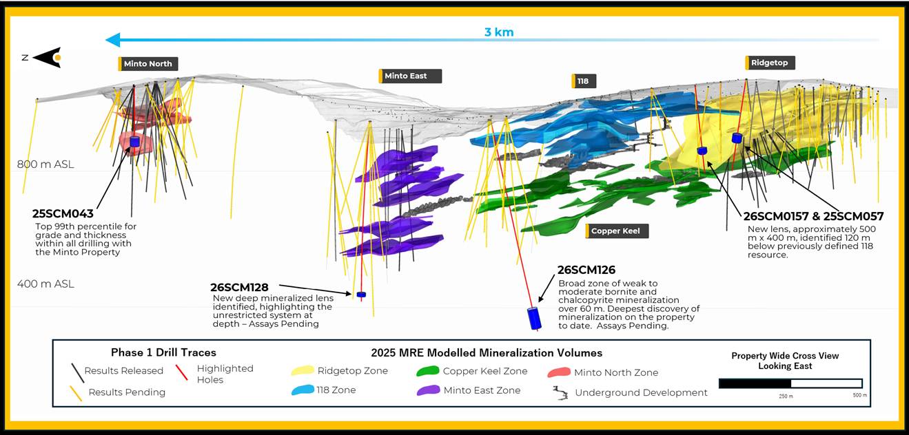 Additional highlights from exploration drilling in the Phase 1 drill program include several of the deepest intercepts of mineralization that have been drilled at Minto over sixty years of previous work. Assay results are still pending for several deep drill holes, including 26SCM126 beneath Minto Main which intersected sparsely disseminated bornite-chalcopyrite mineralization over 60 m from 720-787 metres downhole; and 26SCM128 in Minto East which intersected a 10-metre interval containing bornite and chalcopyrite at a depth of 650 metres downhole. Both of these drill intercepts are indicative that mineralization remains open at depth beneath the limits of previous drilling and in several directions. Additional exploration drilling into these areas is proposed once access to the underground has been re-established.