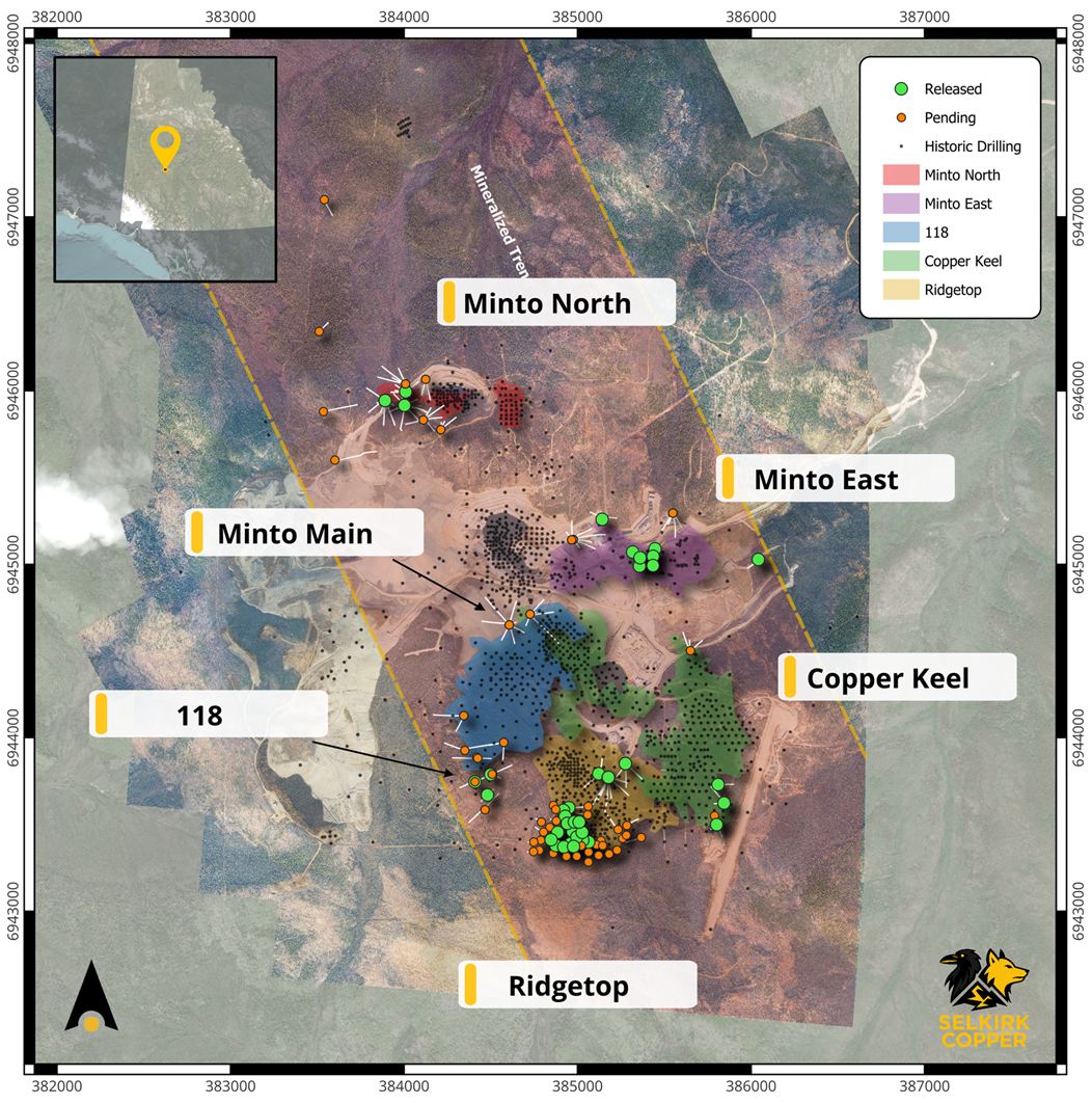 Highlights from resource expansion drilling (Figure 3) include expansion at the Minto North west zone which is estimated to have increased at least two times from the 2025 MRE modelled volume. Drilling in the Minto North west zone returned very high grades in multiple drill holes including 25SCM043 (see previous release on February 19, 2025). This drill hole intersected 3.52% Cu, 3.51 g/t Au and 17.04 g/t Ag (6.3% CuEq) over 16.7 m, within a broader zone of 2.09% Cu, 1.84 g/t Au and 9.48 g/t Ag (2.9% CuEq) over 32.9 m. This result is within the top 99th percentile of grade and thickness for all drilling within the Minto database, which spans six decades and includes more than 1,400 drill holes and more than 4,300 significant intercepts. Additional assay results are pending from the Phase 1 drill program at Minto North, and the mineralized lens remains open to the south and will be a priority for further follow-up during the Phase 2 drill program.