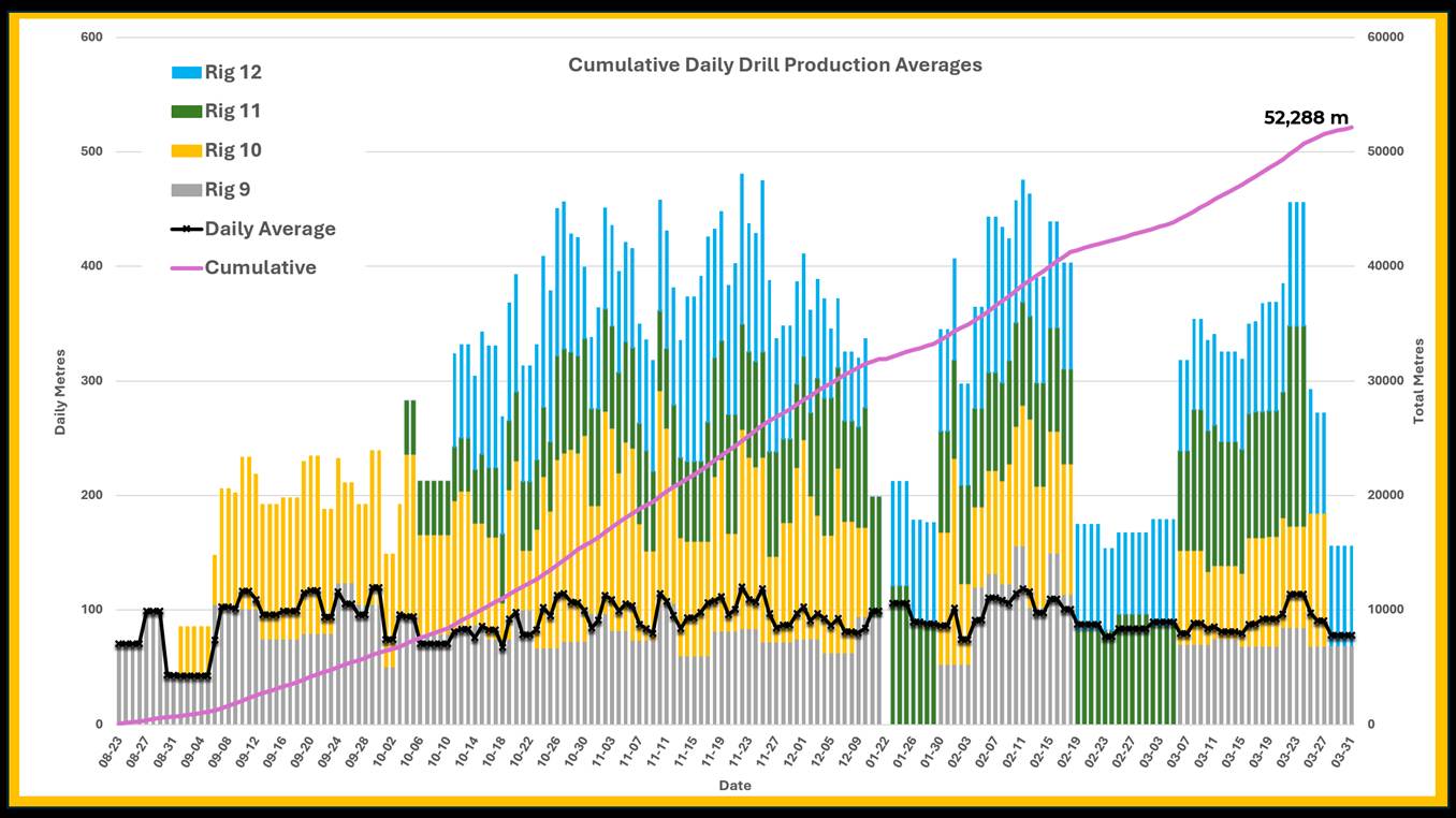 The Phase 1 drill program was conducted between August 2025 and March 2026 with four diamond drill rigs. Drilling was continuous throughout this time, except for a six-week break during December to January when winter temperatures on site reached as low as -55°C. Drilling was completed safely, with no medical aid or lost-time injuries, and minimal downtime. Drilling productivity was very high, including individual drills producing more than 200 metres per day in some instances, with an average of 94 metres per day per drill throughout the entire program (Figure 1). High productivity and relatively low cost-per-metre enabled surpassing of the originally planned 50,000 m program, resulting in completion of 52,288 metres representing 105% of the initial plan.
